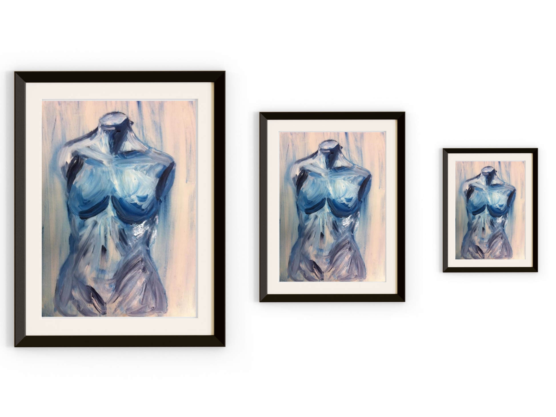 This evocative painting echoes the timeless beauty of ancient sculptures, reminiscent of the Venus de Milo and other classical masterpieces whose missing heads and limbs only enhance their mystique. The fragmented torso, painted in ethereal shades of blue, carries the same transcendent quality, stripped of identity yet universally powerful. Like the weathered marble statues of antiquity, this figure speaks to endurance, beauty, and the passage of time.
